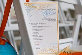 Décorer une ceremonie de mariage avec des éventails: c’est une idée originale: ici, la décoration de mariage bleue et orange est parfaitement mise en valeur avec des lanternes bleu turquoise rondes, mais petites pour décorer les chaises. tandis que chaque invité reçoit en cadeau un éventail en papier orange.