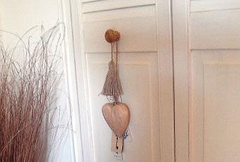 L'ensemble est peint avec la peinture Pointing de chez Flamant. Pour la décoration finale, un coeur en bois de la marque déco Jardin d'Ulysse est suspendu à la poignée ronde restée en bois brut. Viennent compléter la déco, de jolies étiquettes en papier envoyées par Imaginess et un pompon en lin de chez Eurodif.