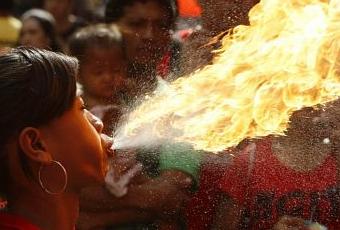 Une cracheuse de feu en pleine action lors des cérémonies entourant le Nouvel An dans le quartier chinois de Manille, aux Philippines.