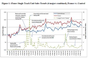 Il est vrai que de nombreux avertissements aux fraudeurs ont été envoyés durant l’année, ce qui a pu freiner en quelque sorte le téléchargement illégal. C’est du moins ce que prouve une étude menée par quatre chercheurs du Wellesley College et de l’université de Carnegie Mellon aux États-Unis. Cette étude menée sur 3 ans était destinée à analyser l’efficacité de mesures anti-piratage et comme nous le montre le graphisme ci-dessous, il semblerait qu’en France grâce à Hadopi la progression des ventes sur iTunes se soit intensifiée.