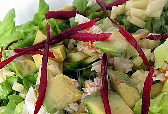 Disposer un peu de salade sur chaque assiette, ajouter quelques cubes d'avocat, des miettes de surimi et des morceaux de pommes, sans oublier la betterave râpée.