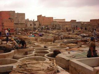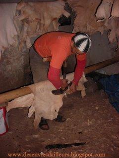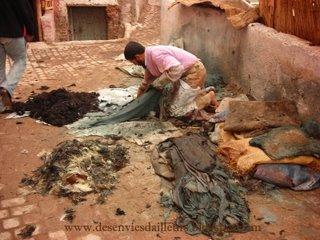 Chaque étape pour réaliser le cuir nous est montré. Tout d'abord, il faut enlever les poils. Les peaux de dromadaires, de moutons, de chèvres,... sont trempées dans de la chaux pour que les poils se retirent plus facilement (photos 1).Par la suite, il faut les laver (photo 2). Pour cela il faut tremper les peaux, pour les assouplir, dans des grands bacs composés d'urine d'animaux et de fiente de pigeons(ce sont les odeurs irréspirables!). Et enfin, il faut lisser la peau (photo 3).
