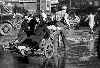 « Les filles au diable »au pied de l’Église Saint-Eustache, est la première photo prise par Robert Doisneau dans le quartier des Halles en 1933.