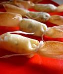 A la pointe de chaque triangle, déposer quelques dés de pomme, quelques lamelles de fourme, éventuellement quelques graines de cumin puis rouler le tout pour former un bonbon. Fermer avec de la ficelle de cuisine (un noeud simple suffit... perso j'avais fait des double-noeuds, résultat on a bien galéré à les enlever !). Enfourner à 180°C pendant 10 minutes environ (surveiller car ça brûle vite).