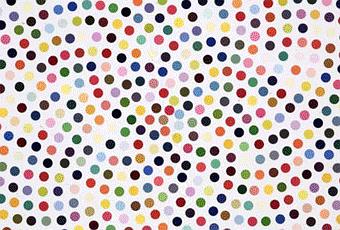 Ce Young British artiste, duquel vous connaissez sûrement son requin dans du formole, ses étagères de médicaments ou encore son crâne en cristal dont je fais état ici – avant de faire l’objet d’une exposition personnelle à la Tate Gallery prochainement, a réalisé des gros points couleur pastelle, disposés de manière parfois désordonnée mais astucieuse, sinon alignée, certainement à l’aide d’une machine industrielle (aucun coup de pinceau n’est visible à l’oeil nu) presque comme du papier peint.
