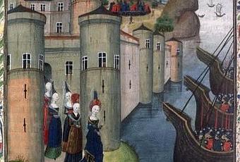 illustration: miniature représentant Jeanne La Flamme accueillant la flotte anglaise à Hennebont.