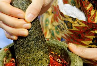 Temps de cuisson : 10 minPour cette recette, il vous faut absolument un mortier. Le mixer/blender ne va que couper les ingrédients, mais le parfum ne sera pas du tout le même qui si on pile le tout.