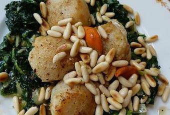 Un repas équilibré qui allie le moelleux et le croquant. A déguster en cette pleine saison des Saint-Jacques. Pour l'accompagnement : un oignon, une poignée de pignons de pin, une grosse main de feuilles d'épinards frais.