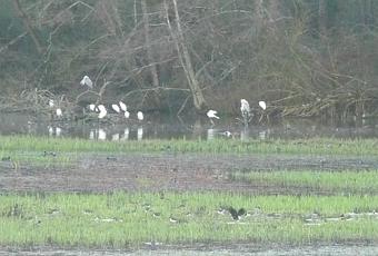 Sans grande surprise, nous distinguons un campement d’aigrettes surmonté d’un héron cendré. Les aigrettes sont trop loin pour que l’on puisse savoir s’il s’agit de l’aigrette gardette ou de la grande aigrette, mais ceci, au fond, importe peu :