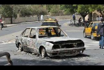 Une voiture brûlée après les heurts du samedi 28 janvier 2012 à Dakar, au Sénégal. © Seyllou/AFPL'opposition et la société civile sénégalaises faisaient front dimanche contre le chef de l'Etat Abdoulaye Wade dans l'attente d'une décision du Conseil constitutionnel sur les recours contre la validation de sa candidature à un troisième mandat à la présidentielle de février.