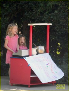 December 28, 2011 – Sur les soeurs Affleck, qu’elle n’épargne pas trop, mais honnêtement il y a de quoi Violet and Seraphina Affleck held a lemonade stand outside of their house yesterday, selling both traditional and sugar-free lemonade. Wow. I knew things were bad at the Garner-Affleck compound, but I didn’t know they were this bad. I hope they made enough money to afford hairbrushes … or electricity in their house.