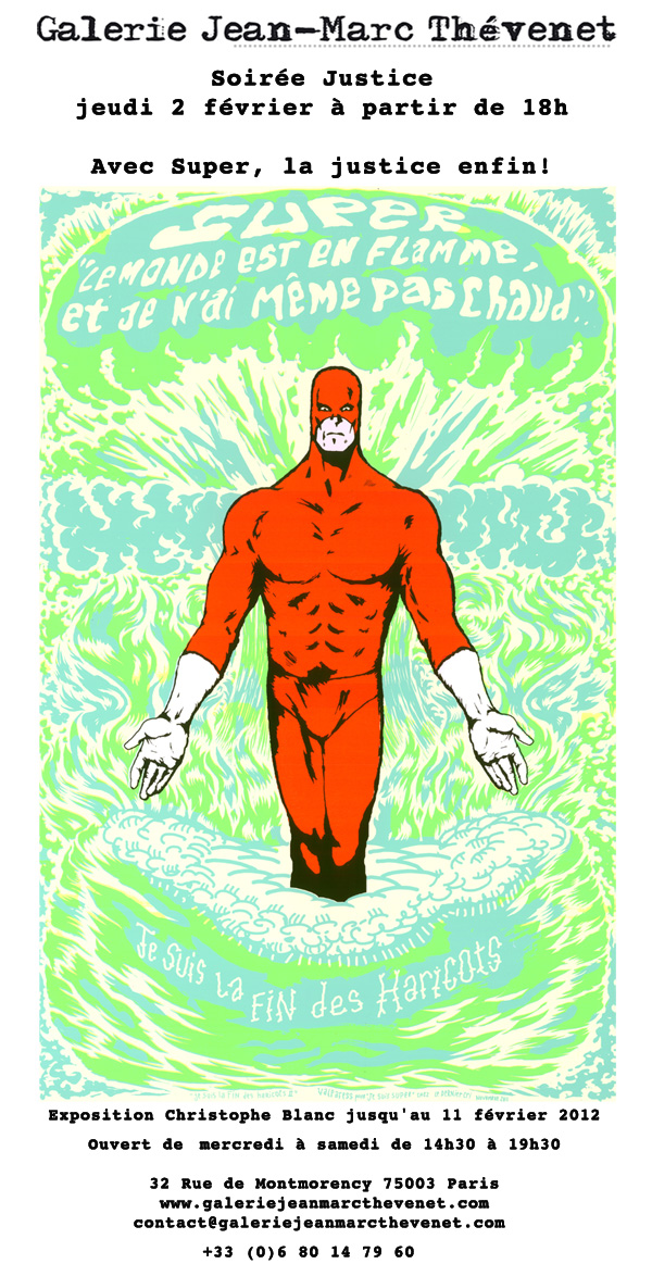 - jusqu'au 11 février 2012 : exposition-vente Je suis Super de Christophe Blanc à la Galerie Jean-Marc Thevenet - www.galeriejeanmarcthevenet.com - 32 rue de Montmorency - 75003 Paris - la Galerie Jean-Marc Thevenet prolonge cette exposition de Christophe Blanc, auteur du héros des dessins animés, Je suis Super. Christophe Blanc expose une "série d’œuvres graphiques et modelées qui plongent le héros costumé au cœur d'une tempête de neige et de mystères." Ce projet Super est né durant les études aux Beaux-Arts de Christophe Blanc. Son héros en collant ressemble par sa musculature à tous les super héros justicier du comics américain. Sous des aspects humoristiques, l'auteur questionne l'absolutisme et remet en cause l'utilité de ces super héros. Une soirée Justice est prévue le 2 février 2012 à partir de 18h00.