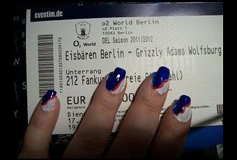 Mes ongles de supportrice pour aller soutenir les Eisbären berlinois sur la glace (moi j'étais dans les gradins, pas sur la glace, si j'dois être entourée de hockeyeurs je préfèrerais dans les vestiaires :p), je vais essayer de faire une déco aux couleurs du club pour chaque match que j'irais voir, fan jusqu'au bout des ongles ! J'ai d'abord posé le blanc Snow Motion de Catrice, ensuite recouvert une moitié de l'ongle avec le bleu Kiko 335 (au début j'avais voulu le faire au scotch mais sur le 1er doigt un peu de vernis blanc est parti du coup je l'ai fait en free style) puis un trait rouge au pinceau avec le P2 Open Your Heart.