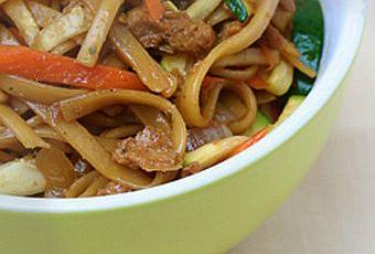 Dans un wok faire revenir le poulet dans l'huile d'arachide avec une pincée de sel, du poivre et le sucre. Lorsque les morceaux sont dorés, ajouter les haricots coupés en morceaux, le chou, les carottes en bâtonnets et faire revenir quelques instants. Enfin ajouter les vermicelles et les crevettes égouttées, arroser avec les deux sauce soja et couvrir. Laisser cuire à feu doux en remuant de temps à autres. En fin de cuisson, avant de servir, ajouter la coriandre hachée.
