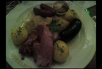 Je suis une fan de la gastronomie alsacienne, je voue un culte à la choucroute, aux flammenküche, au foie gras d'Alsace, etc.. En plus c'est les voisins donc c'est un peu la cuisine de chez moi. Alors quand j'ai vu ce resto alsacien, Gugelhoff, je me suis dit c'est bon faut que j'y aille ! Chose faite samedi soir après la rando de la mort, j'ai longuement hésité entre raclette et choucroute (oui la raclette c'est pas alsacien mais ils proposent quelques plats des voisins sarrois, suisses et lorrains), bon personne n'étant partant pour la raclette (fallait être au moins 2) j'ai pris la choucroute... ils mettent du boudin noir dedans O_O ! Je demande sans boudin et ils me proposent de mettre plus de knak, ok ! Mais quand le plat arrive y'a le boudin, et les knack ont plus un goût de saucisses de morteau, faut que j'évite de comparer avec celle de maman (qui est la meilleure du monde, ma mère comme sa choucroute d'ailleurs), mais ma choucroute de samedi soir reste très bonne. D'autres ont pris Flamm spéciales, baeckenhoff (désolée si je massacre l'ortho), boeuf bourguignon, tous satisfaits. Et pour bi