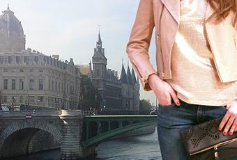 En silhouette, on mêlera le blush à une touche de gold. Porté ici sous une microveste en cuir, il réhausse la silhouette et illumine le teint.