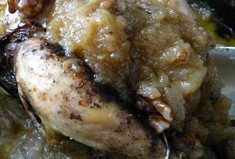 Vingt minutes avant la fin de cuisson, ajouter autour de la faisane une main de cerneaux de noix. En fin de cuisson, verser quelques cuillerées à soupe de crème fraîche liquide dans la purée de pommes.