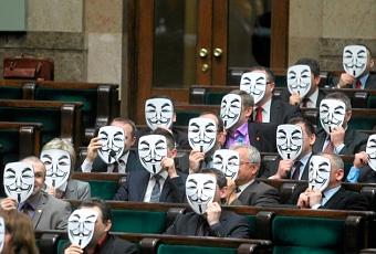 En Europe, la Pologne a été l’un des premiers pays où des signes de contestation de ce projet ont émergé, des manifestations de grande ampleur ont eu lieu dans le pays et la pression politique et publique auront eu raison du projet de loi dans le pays. Les députés polonais du parti de gauche ont également été très hostiles à la ratification du texte en arborant solidairement un masque de Guy Fawkes au parlement en guise de protestation (photo ci-contre) le 26 janvier soit deux jours avant l’annonce initiale du gouvernement de l’éventualité de non-ratification du texte.