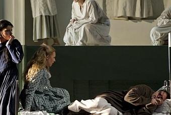 Car dès le départ le décor (quasiment unique) est planté. Un lit d'hôpital , de hauts murs verts et blancs, de ce vert "hôpital" un peu pâle, et un personnel de médecins, d'infirmières et d'infirmiers, qui circule. Hermann en pyjama apparaît, et le livret se déroule comme une succession de réminiscences qui vont peu à peu reconstituer l'histoire. les personnages circulent le plus souvent sur un espace surélevé, et regardent du haut un Hermann qui serait réduit à l'état de bête de zoo. Dans ces visions se superposent les personnels hospitaliers et les personnages de l'histoire (la Comtesse y apparaît comme médecin par exemple, comme traces de l'esprit malade d'Hermann. Un ensemble très cohérent, qui n'a pas vieilli, comme pour toutes les bonnes productions.
