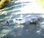 Une vielle dame traverse la route sur un passe piéton quand deux voiture se crashent devant elle.