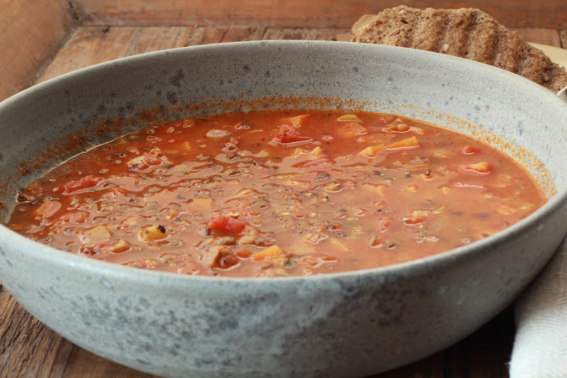Épluchez et lavez les légumes , coupez les ainsi que l'oignon et l'ail en très petits morceaux . Dans une grande casserole , faites fondre le beurre , ajoutez y les légumes , l'oignon et l'ail et une pincée de sel . Faites revenir à feu doux durant 15 minutes en remuant régulièrement . Ajoutez le thym et le paprika , mélangez et versez les tomates , les lentilles et le bouillon . Vérifiez l'assaisonnement et salez si nécessaire .Faites cuire couvert à feu doux durant 30 minutes .