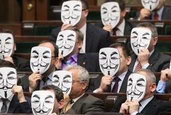 Membres du Parlement polonais protestant contre ACTA avec des masques contrefaits (les royalties reviendraient à Warner Bros dans le cas contraire), un pied de nez à ACTA