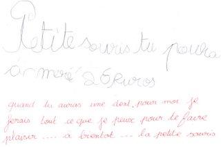 Oui cela n'apparaît pas très clairement....ouvrir en grand dans une autre fenêtre vaut le coup d'œil quand même!!!.....le document top confidentiel trouvé sous son oreiller n'a pas était facile à scanner..... En gros la petite fée a tout simplement écrit un mot pour racketter la petite souris !!!???!!!... afin obtenir la somme demandée par le magasin pour acquérir le fameux poupon ....soit 26 euros!!!!!!!!