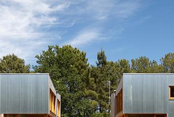 Le bâtiment se développe dans le sens de la longueur. Composée de deux volumes de taille identique, la maison est en fait construite sur la même dalle, les deux volumes n’en formant qu’un. Seule une terrasse – lieu de vie, d’échanges, de jeux – sépare les deux modules. Cette maison est atypique. Issue d’un principe contemporain oui mais aussi du rustique, structure en bois, bardage en bois et en métal naturel, fenêtres en aluminium.