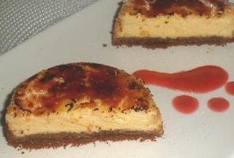 J'ai voulu réaliser 2 desserts une crème brûlée et un cheese cake . Ne pouvant réaliser les 2 par manque de temps. J'ai donc décidé de faire un cheese cake parfumé à la vanille de le laisser refroidir puis de le saupoudrer de sucre en le caramélisant au chalumeau comme une crème brulée . Et voila mes 2 desserts réunient en un seul dessert .