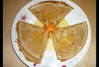 Servir les crêpes (chaudes c'est meilleur) avec le jus d'une orange. Et décorer avec les zestes.