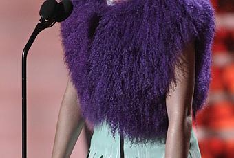 Au Beach Bowl After Party, la belle Katy (tout est relatif) est arrivée en robe Versus franchement pas au goût du jour, maquillée comme un camion volé, le tout supplanté par une fourrure violette digne de la pire friperie et d'une coloration bleu-délavé. La bague façon vintage ne fait qu'alourdir le look. Sympa, ça détonne.