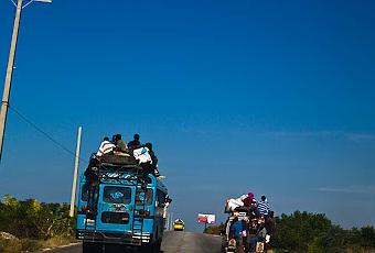 On rencontre toujours ces camions où des humains sont accrochés dans un équilibre qui me semble toujours précaire. Pour la petite info, on suit un bus qui roule à plus de 110 km au moment où je capte cette photo !! Outre ces haïtiens en équilibre sur des tacots, le journalisme haïtien est peut-être en train de perdre l’équilibre. Pour être honnête, je n’ai jamais cru à l’objectivité comme position intellectuelle, entre autres dans le domaine de la nouvelle et de son analyse. J’ai passé 15 ans de ma vie professionnelle dans le secteur de la recherche sociale, assez pour ne plus croire possible tout raisonnement ‘objectif’. Ça ne veut pas dire qu’on fait ou pense n’importe quoi, mais je préfère parler de la notion de subjectivité consciente ou encore d’intersubjectivité. Les journaux français me semblent plus clairement identifiés à un courant de pensée, alors que chez nous au Qc, il sont encore trop nombreux à se bercer dans l’idée de l’objectivité. Les journalistes haïtiens sont à cet effet en train de perdre un peu de leur vernis. Je ne parle pas de ces animateurs de radio qui n’avaient plus de vernis à perdre (des ‘vrais’ journalistes pourraient vous dire que ces animateurs ne sont justement pas des journalistes), mais de gens pour qui j’avais développé une certaine estime au cours des dernières années. Le président et les médias ont eu plusieurs occasions de se bagarrer depuis un an et l’altercation de la semaine dernière (le président a refusé de répondre à une question d’un journaliste après lui avoir demandé pour quel média il travaillait) ouvre la porte à certaines prises de position moins ‘molles’. Aujourd’hui, le 7 février, on soulignait un peu partout le départ de Duvalier (1986), donc la victoire de la démocratie, des droits de l’homme, de la liberté … L’évènement du jour a permis à certains journalistes de tisser des liens avec la dernière sortie du président, les accusations de violation des droits de l’homme contre Duvalier qui ne sont pas retenues, la présence de Duvalier aux côtés de Martelly lors de la cérémonie de commémoration des deux ans du tremblement de terre, les accointances duvaliéristes de proches du président, … Tout un argumentaire pour nous souligner que la démocratie haïtienne était sur le bord d’un précipice, à deux pas de perdre une fois de plus un équilibre toujours fragile.