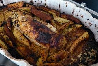 Sortir le filet mignon en maissant le four allumé, déglacer les sucs du fond de plat avec trois ou quatre cuillerées à soupe de crème fraîche liquide. Disposer les pommes de terre aux épices autour et remettre pour 10 minutes au four.
