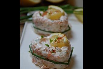 J’utilise des moules en silicone en forme de coeur avec une cavité sur le dessus. Cela permet de rajouter des choses sur le dessus (sauce, condiment). Je vous conseille donc de rajouter sur le dessus des oeufs de saumon. C’est délicieux !
