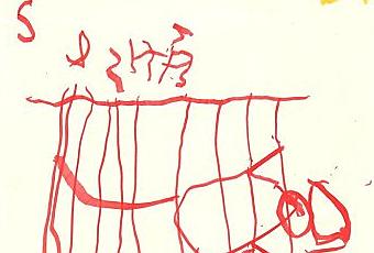 Ici un dessin qu'il a fait à Noël, il faut le regarder de coté : un sapin, et un père Noël qui monte à l'échelle. En hauteur, en rouge, son prénom, et là on voit qu'il commençait à vraiment fatiguer...