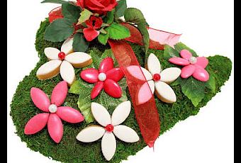Super choupinet non ? De quoi se compose-t-il ? Ce joli coeur (pour votre chérie les mecs) est un coeur de mousse naturelle recouvert de jolis fleurs faîtes de calissons (miam) et de dragées (re-miam).
