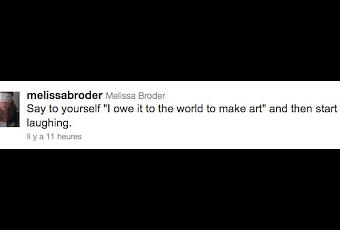 De tous les comptes art @ twitter, mon préféré est sans aucun doute celui de la poète @melissabroder! Je relis toujours ses tweets plusieurs fois pour leur beauté inusité (belle laideur, parfois), l'extraordinaire imagination qui leur donne forme et qu'ils génèrent ainsi que pour les fortes et divergentes émotions qu'ils me font vivre en si peu de caractères!