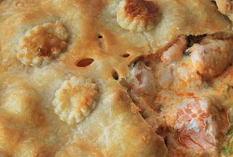 Étalez finement la pâte sur un plan de travail légèrement fariné . Elle parait au début très collante mais assez vite elle s'étale très bien . Recouvrez le plat d'un disque de pâte . Appuyez sur les bords du plat pour que la pâte y adhère . vous pouvez y ajoutez des décorations réalisées à l'aide de l'excédent de pâte . Dorez la pâte au pinceau avec un oeuf battu . Faites 4 petites incisions au centre pour la cuisson . Faites cuire 25 à 30 minutes pour que le pie soit bien doré .
