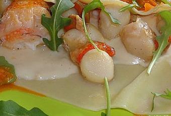 Assaisonnez la langouste et les noix de saint jacques les faire cuire dans une poêle sur feu vif avec de l'huile d'olive 2 à 3m.