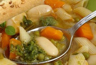 Verser le minestrone dans des assiettes creuses. Saupoudrer de parmesan puis ajouter le pesto et les feuilles de basilic lavées. Servir aussitôt accompagné de gressins au sésame.