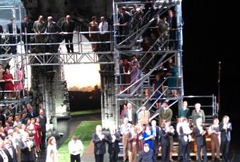 Dès le second acte, dans les mêmes espaces: la scène est constituée comme au premier acte d'une ruine de portail monumental gothique et de quelques piliers et de pans de mur, installés sur une tournette, qui ainsi amène sans cesse un changement d'espace et une mobilité des foules, sans que le plateau n'ait à être modifié. Le fond de scène a changé, des ruines on est passé aux grues, on reconstruit...on commence alors à comprendre le propos de Kupfer, qui inscrit ces Maîtres dans un contexte particulier et dans un univers qui est au fond l'opposé de celui de Katharina Wagner à Bayreuth, qui fait des Maîtres une réflexion sur le conformisme en art, sur le populisme et le refus de la marginalité. L'univers de Kupfer est d'abord un univers incroyablement optimiste. Lui qui vient de l'Est et qui a été marqué par une culture scénique plutôt idéologique, le voilà qui fait de ce symbole d'une germanité qu'on a tendance à refuser (Les Maîtres Chanteurs furent le seul opéra de Wagner qui trouva grâce aux yeux du nazisme finissant, et qui eut droit d'être représenté à Bayreuth jusqu'à la fin) le symbole d'une germanité et d'une Allemagne retrouvées, dans le bonheur et la joie d'un futur ouvert et réussi, une germanité ouverte et moderne. De fait, le troisième acte se déroule sur fond d'Allemagne reconstruite (gratte-ciels), seuls les échafaudages subsistent autour de l'église centrale, mais on s'imagine bien que bientôt, tout sera reconstruit (on pense irrésistiblement à la Frauenkirche de Dresde). Dans une Allemagne qui retrouve sa place et sa tradition, les Maîtres retrouvent le symbolique positive et non pervertie... Kupfer nous étonnera toujours. On était loin de s'attendre de sa part à une lecture aussi ouverte et aussi positive de cette œuvre. Il en résulte donc à la fois une construction très précise des personnages, une attention à garder à la fois la fraîcheur et les gestes de la comédie - si j'osais, je dirais aussi...de l'opérette. la Festswiese est un authentique défilé des corporations, mais un défilé comme on en voit dans les carnavals d'aujourd'hui, si populaires encore en Allemagne (voir le Carnaval de Mayence, par exemple);
