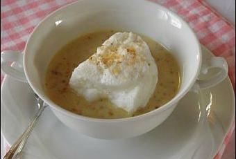 Une association plutot raffinée celle d'une crème anglaise parfumée à la vanille et au pralin surmontée d'un petit blanc en neige délicat et vanillé.
