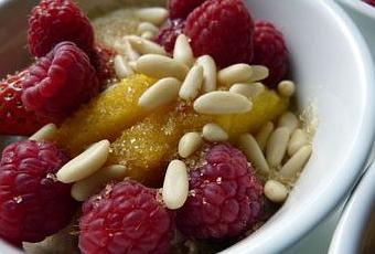 Deux cuillerées à soupe de fromage blanc lisse à 20% de MG, un peu de sucre en poudre. Mélanger dans des ramequins individuels. Ajouter une rondelle d'ananas frais coupée en deux, une fraise, six ou sept framboises, une feuille de menthe, une pincée de pignons de pin.