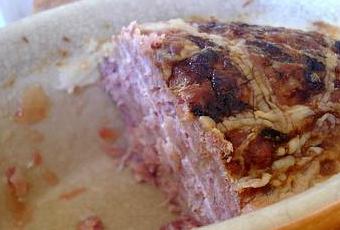 0,9kg de poitrine désossée, 1,8kg d'épaule désossée, 100g de foie de porc, 54g de sel fin, 9g de poivre blanc fraîchement moulu, 3 oeufs, 6 oignons moyens, 4 càs de farine, 5g de sucre en poudre, muscade, 100g de crépines de porc.