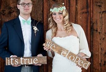 Les deux pancartes en vrai bois personnalisées, pour que les photos de couple soient uniques: peignez vous meme un message sur chacune des planches et vous obtiendrez de très belles photos de mariage personnalisées. On peut par exemple penser a un message thank you, écrit sur deux planches, ou bien copier l’idée de ces jeunes mariés: it’s true we cloped: l’idée de passer a des avoeux le jour de son mariage c’est quand meme charmant et vrai!