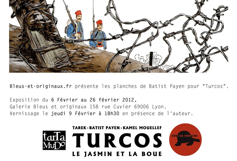 - jusqu'u 25 février 2012 : Exposition-vente de Turcos de Batist Payen et Tarek à la Galerie Bleus et Originaux - 158 rue Cuvier - 69006 Lyon - www.bleus-et-originaux.fr. A l'occasion de la sortie de l'album Turcos, les deux auteurs proposent des planches originales et des illustrations de Batist mais aussi quelques peintures de Tarek. Les deux auteurs chez Paquet ont pris leur indépendance et publient désormais dans leur maison d'éditions Tartamudo. Turcos raconte l'histoire d'Alouache Ahmed Saïd Ben Hadj né en 1884 à Saint-Arnaud, commune de Constantine et incorporé en 1912 dans l'armée française dans le fameux 11e Régiment des Tirailleurs Algériens. L'album propose de découvrir la Première Guerre mondiale sous un autre jour ...