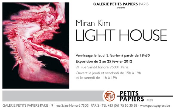 - jusqu'au 25 février 2012 : exposition-vente Light Housede Miran Kim à la Galerie Petits Papiers - www.petitspapiers.be - 91 rue Saint-Honoré - 75001 Paris - Ouvert le jeudi et vendredi de 15h00 à 19h00 et le samedi de 11h00 à 19h00 « Il y a cinq mille ans, les auras sont apparues dans les peintures religieuses pour représenter des figures spirituelles. L'exposition de peintures de Miran Kim intitulée « light house » fait référence à ces auras. En utilisant le corps comme réceptacle de lumière l'aura n'enveloppe pas seulement les sujets, elle est centrée à l'intérieur comme un vaisseau sacré. Ce sont là des images vibrantes d'émotions. » Marshall Arisman.