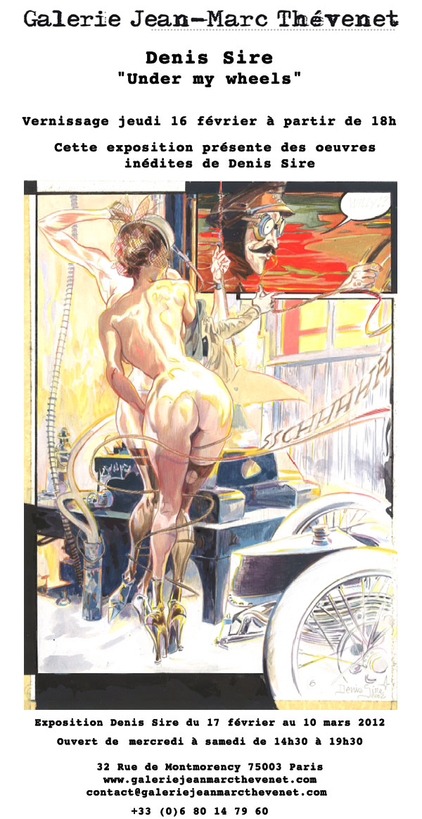 - à partir du 17 février jusqu'au 10 mars 2012 : exposition-vente Under my Wheels de Denis Sire à la Galerie Jean-Marc Thevenet - www.galeriejeanmarcthevenet.com - 32 rue de Montmorency - 75003 Paris - Déjà hôte la galerie lors de son ouverture en juin 2011, Denis Sire en est à nouveau l'invité pour des nouveautés et inédits, toujours sur le thème des engins à moteurs accompagnés de jolies créatures... Le vernissage est prévu le samedi 18 février à partir de 18h00. L'artiste est à la fois un auteur de bandes dessinées et un illustrateur hors pair. Avec son look très rock, l’artiste originaire de Saint-Nazaire est un fan de musique des années 60 et de sports mécaniques. S’il a pris du recul pour la sortie d’un nouvel album chez Dupuis, il incarne la brillante génération découverte par Métal Hurlant. Son rédacteur en chef de l’époque, Jean-Pierre Dionnet lui a donné la chance en 1976 de publier dans son numéro 13, Menace diabolique, une bande dessinées de science-fiction. Il faut dire que le jeune diplômé des Arts Appliqués de Paris a du talent. Il signera peu après, avec Yves Chaland et Serge Clerc, La vie exemplaire de Jijé. Son premier album Bois Willys a été publié aux Humanoïdes Associés en 1991 et retrouvera une nouvelle jeunesse en 1992 sous le nouveau titre Ziblyne et Bettie. Après le futur, son inspiration touche les années 80 avec 6T Mélodie, un recueil d’histoires courtes parues dans Métal Hurlant. Entre temps, il signe Triste Jeudi dans l’Écho des Savanes. En 1997, il illustre l’Île des Amazones, écrit par Jean-Pierre Dionnet. Denis Sire a signé de très nombreuses couvertures de romans, de magazines ou de disques, des affiches. On a pu voir ses œuvres en 2003 à la galerie Mot’Art, en 2004 aux Rendez-vous de la Bande Dessinée d’Amiens et en 2008 au Festival International de la BD d’Angoulême. Enfin sa carrière artistique est retracée dans l’ouvrage Denis Sire édité par Nickel Productions et Heavy Metal en 2006.