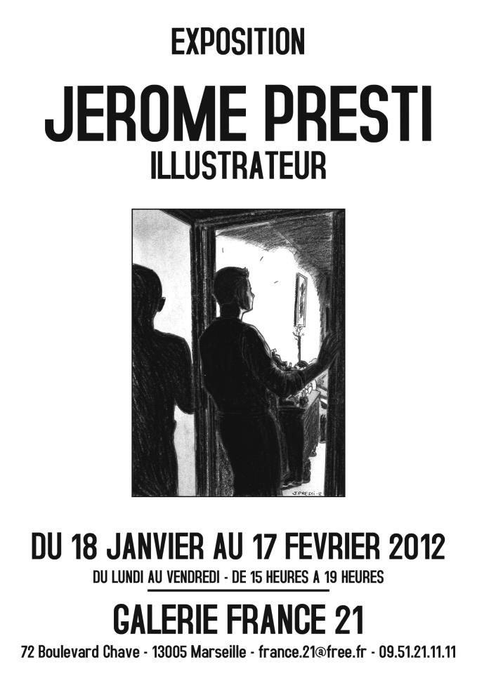 jusqu'au 17 février 2012 : exposition-venteJérôme Prestià la Galerie France 21 - 72 Boulevard Chave - 13005 Marseille - ouvert du lundi au vendredi de 15h00 à 19h00. Le jeune auteur méridional de 33 ans a fait ses études de management à Marseille mais a la fibre bande dessinée dans la peau. Il a travaillé dans la grande équipe de Jacques Martin, qui lui a confié l'album didactique Voyages de Loïs à Versailles sous Louis XIII dans la collection Martin chez Casterman. Sans perdre ce lien, ce passionné de cet univers s'en libère peu à peu pour proposer des projets plus personnels, mais toujours dans une certaine nostalgie de la ligne claire qu'il apprécie de Jacobs à Martin. Il est l'auteur l'histoire en BD de la ville d'Hyères, la Fabuleuse Histoire de Hyères-les-Palmiers, paru en mars 2008. Il a aussi signé plusieurs ouvrages ou travaux dont une bande hebdomadaire pour La Provence, pendant quinze semaines, d'octobre 2007 à 2008, une bande pour Science et Vie Junior (septembre 2008). Il a encore participé au collectif Amnesty International publié chez Glénat en 2006 et dessiné les illustrations de deux bouquins édités par l'Amicale Jean Ray. En même temps d'autres dessins seront exposés à Aix-en-Provence. Une double occasion de découvrir un jeune talent, de surcroît très sympathique. auteurs.