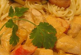 Tailler le poulet en gros cubes. Les mettre à dorer dans un peu d'huile d'olive. Ajouter les poivrons en cubes puis le lait de coco et la pâte de curry. Laisser mijoter à feu doux.